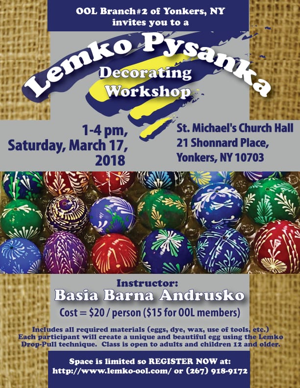 Come join us just in time for Easter Basket Blessing. Each participant will create unique and beautiful eggs using the Lemko Drop-Pull technique. Includes all required materials (eggs, dye, wax, use of tools, etc). Open to both adults and children over 12. All levels of experience are welcome.