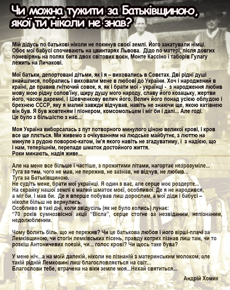 “Here is a little story … I sincerely ask for the fact that I have no opportunity to write the real Ukrainian “и” and and “йи”- there is no keyboard. My father Lemko, his family had to leave in the USSR in 45 … it took a little time … and I, his son, too, was forced to leave the house, because I happen to be born on the Donbas … everything was lost … and my family and children are now in a foreign land … Not in gameritsia … and … in the east …. Lord! Give a good people a peace and calm … “