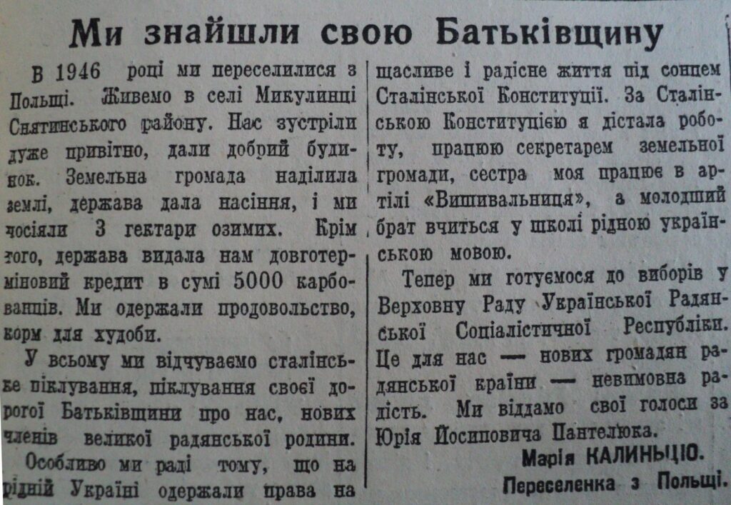 Ймовірно, через бойові дії, які вела в той час УПА, відразу по війні українцям із Польщі в західних областях УРСР оселятися не дозволяли. Газета “Прикарпатська правда”, зокрема, писала про 122 родини українців, що переселяються на постійне місце проживання аж до Херсонської області. “Здрастуй, Батьківщино!” — схвильовано кажуть люди, що прибули на землю своїх батьків”. Газета оминула увагою те, що батьки та діди цих переселенців — за сотні кілометрів, поховані у «польській» землі.