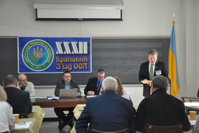 The 32nd OOL National Convention commenced with OOL President Mark Howansky greeting the delegates and guests, including Rev. Dr. Father Bohdan Prach (former Rector and current Vice President of the Ukrainian Catholic University (UCU) in Lviv), Natalia Klymovska (Vice Rector for Development and Communications of UCU); Olha Zarichynska (UCU Donor Relationship Manager); and Rev. Bohdan Tymchyshyn (Rector of St. Basil Seminary). Noting that COVID-19 began immediately following the last OOL National Convention, Mr. Howansky led a moment of silence to honor those who passed away during the last three years, including Yaroslawa Halyk (former President of the World Federation of Ukrainian Lemko Associations), Stefan Kosciolek (former OOL Executive Treasurer) and Walter Uzdejczyk (former OOL Branch #2 member), among others. Mr. Howansky then turned responsibility for moderating the National Convention over to the selected Presidium, led by Chairman Peter Kosciolek, Vice-Chairman Toma Pyz, and Secretary Bohdan Kykta.